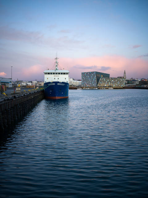 Ég gekk svo eftir Grandagarði út á Norðurbakkann. Sólin var við það að setjast. Það voru ský við sjóndeildarhringinn, svo ljósið var orðið mýkra. Ég virti fyrir mér Hörpu og sá að ljósið kallaði fram alla litina í glerinu. Best að hraða sér og sjá hvort ég nái að fanga húsið í þessu fallega ljósi.